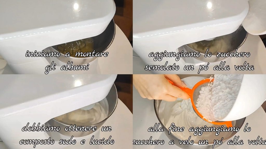 Commençons à monter les blancs d’œufs et ajoutons petit à petit le sucre en poudre. Nous devons obtenir un mélange ferme et brillant. Enfin, ajoutons le sucre glace tamisé petit à petit en mélangeant délicatement pour ne pas faire retomber la meringue.