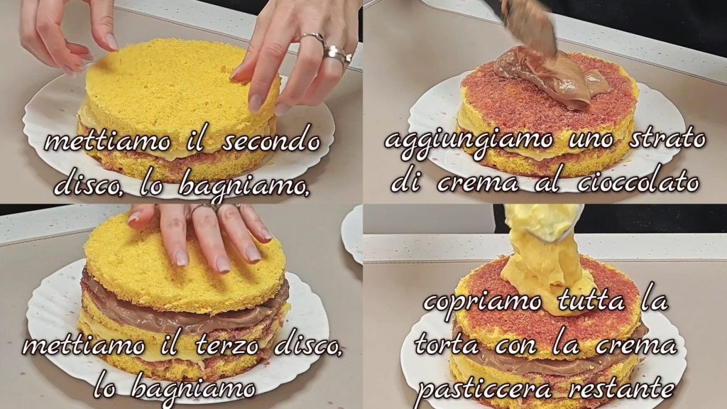 Placez le deuxième disque, imbibez-le. Ajoutez une couche de crème au chocolat. Placez le troisième disque, imbibez-le et couvrez toute la surface avec la crème pâtissière.