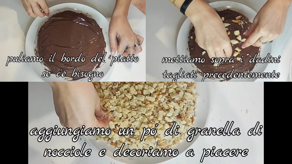 Nettoyez le bord de l’assiette si besoin, puis couvrez avec les dés coupés précédemment. Ajoutez un peu d’éclats de noisettes et décorez selon vos envies.