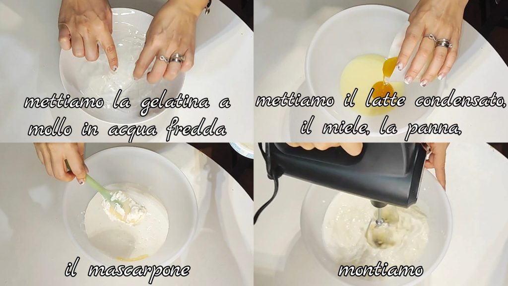 Tout d’abord, mettons la gélatine à tremper dans de l’eau froide. Dans un récipient, mettons le lait concentré, le miel, la crème, le mascarpone et montons.