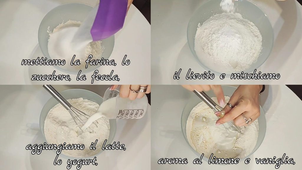 Dans un récipient, mettons la farine, le sucre, la levure, la fécule et mélangeons. Ajoutons le lait, le yaourt, l’arôme de citron et la vanille.