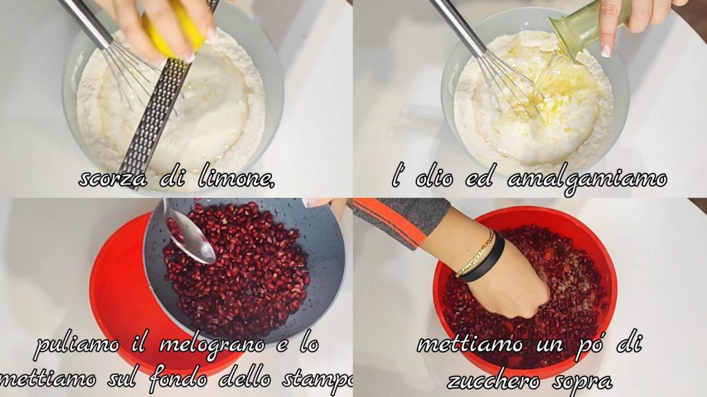 Ajoutons un peu de zeste de citron, l’huile et mélangeons. Nettoyons les grenades et les mettons au fond du moule et ajoutons un peu de sucre dessus.