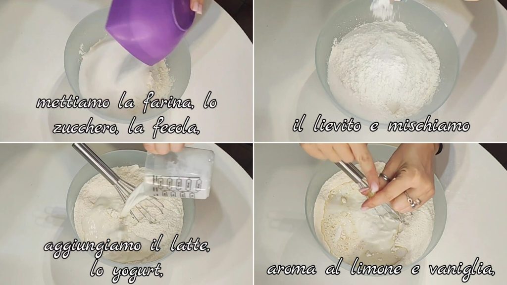 Dans un récipient, mettons la farine, le sucre, la fécule, la levure et mélangeons. Ajoutons le lait, le yaourt, l’arôme de citron et la vanille.