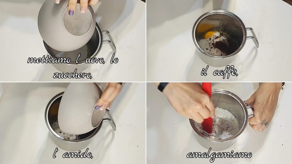 Préparation de la crème : Dans une casserole, mettez l’œuf, le sucre, le café, l’amidon et mélangez.