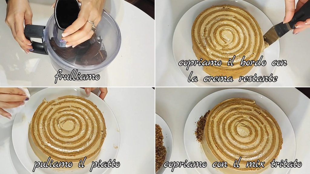 Placez les autres bandes autour pour former le roulé ! Retirez éventuellement l’excès de crème. Ajoutez les restes des bords et quelques pavesini au cacao ou biscuits.