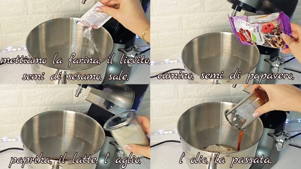Mettons la farine, la levure, les graines de sésame, le sel, le cumin, les graines de pavot, le paprika, le lait, l’ail, l’huile, la purée,