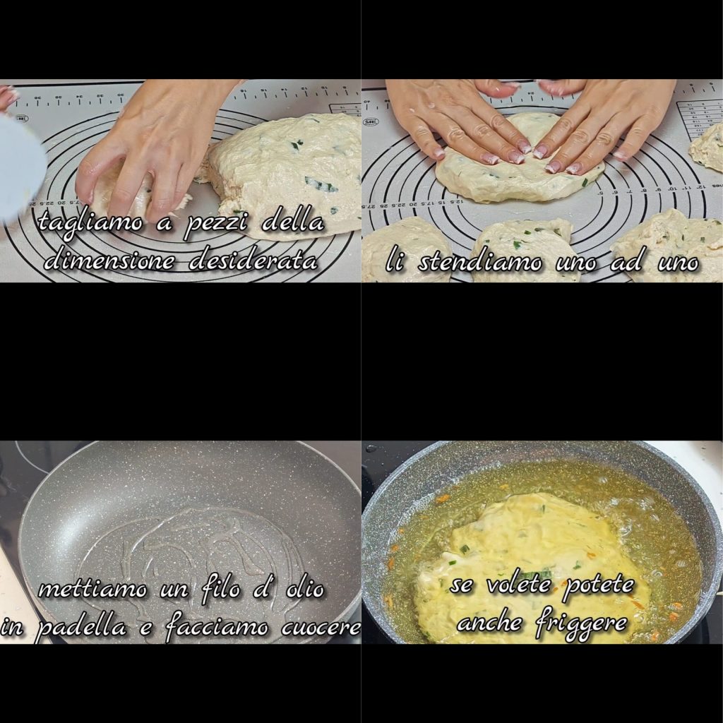 • Découpons la pâte en morceaux de la taille désirée et les étalons un à un (j’ai choisi de les faire un peu épaisses mais vous pouvez les étaler comme vous préférez). Mettons un filet d’huile dans la poêle et faisons cuire des deux côtés. Si vous préférez, vous pouvez aussi les frire.