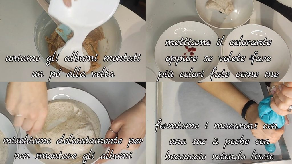 Incorporez délicatement petit à petit les blancs montés de la première étape. Placez un peu de colorant dans un récipient ou utilisez plusieurs couleurs donc plusieurs récipients et ajoutez un peu du mélange obtenu en mélangeant délicatement pour ne pas casser les blancs. Mettez le mélange dans une poche à douille avec une douille ronde et lisse et formez des petites boules.