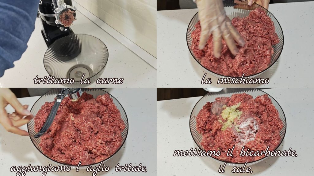 Tout d’abord, hachez la viande et mélangez-la. Ajoutez l’ail haché, le bicarbonate, le sel,