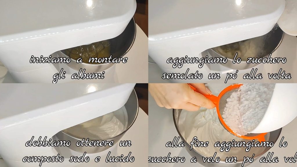 Commencez à monter les blancs d’œufs et ajoutez peu à peu le sucre semoule. Nous devons obtenir un mélange ferme et brillant. À la fin, ajoutez le sucre glace tamisé peu à peu en mélangeant délicatement pour ne pas faire retomber la meringue.