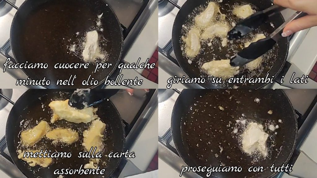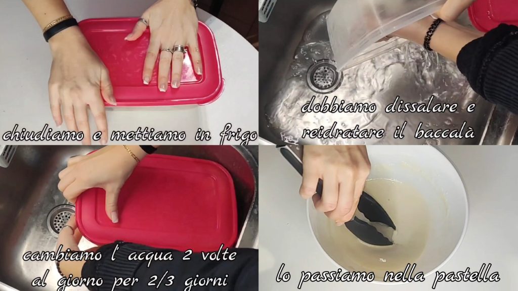 Nous le mettons au frigo et changeons l’eau deux fois par jour pendant 2/3 jours. Nous devons dessaler et réhydrater la morue. Après ce procédé, nous l’égouttons bien et éventuellement nous l’essuyons avec un peu de papier et passons les morceaux dans la pâte à beignet.
