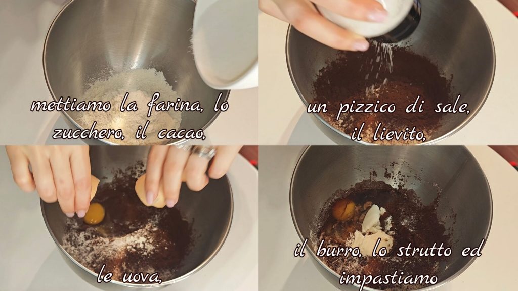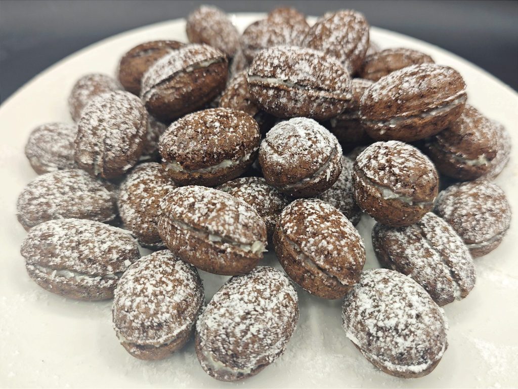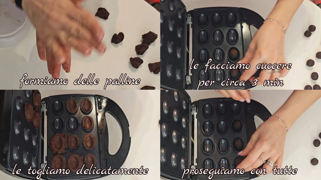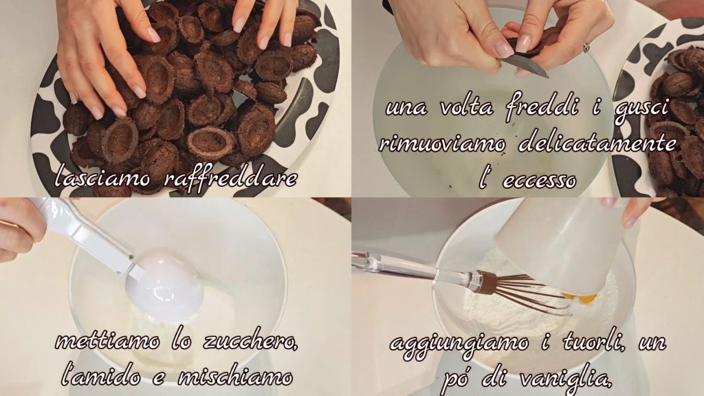 Ce sont de petits gâteaux très jolis et très bons faits avec une pâte sablée au cacao et une crème à la noix de coco. C’est une recette parfaite pour les fêtes car nous pouvons la préparer à l’avance puisqu’il faut un peu de temps pour la préparation, les coquilles vides se conservent très bien dans des récipients hermétiques au réfrigérateur et 1/2 jours avant nous pouvons simplement les remplir de crème, de cette façon nous pouvons nous organiser facilement ! Si vous aimez les noix de pâte sablée, je vous conseille d’essayer aussi les Noix de pâte sablée farcies au caramel et aux arachides et les Noix sucrées farcies de crème au chocolat et noix!