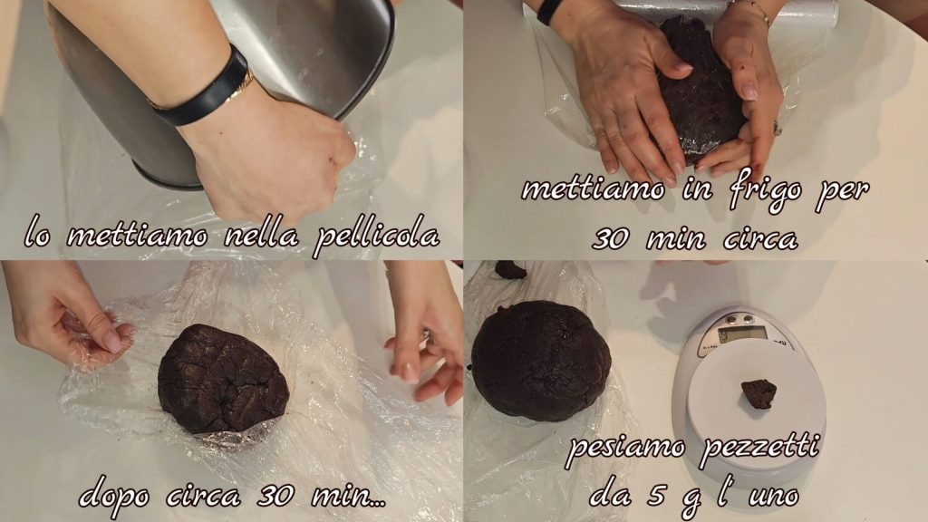 Enveloppons dans un film plastique et mettons au réfrigérateur pendant environ 30 minutes. Ensuite, formons des boules d’environ 5 g chacune.