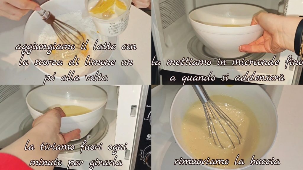 Ajouter le lait bouillant avec le zeste de citron et mélanger. Mettons-le au micro-ondes quelques minutes (jusqu’à ce qu’il épaississe), en le sortant chaque minute pour le remuer. Une fois épaissie, enlevons le zeste de citron.