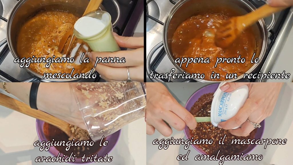 Ajoutez la crème en mélangeant. Dès qu’il est prêt, transférez-le dans un récipient et ajoutez les cacahuètes hachées et le mascarpone. Mélangez bien.