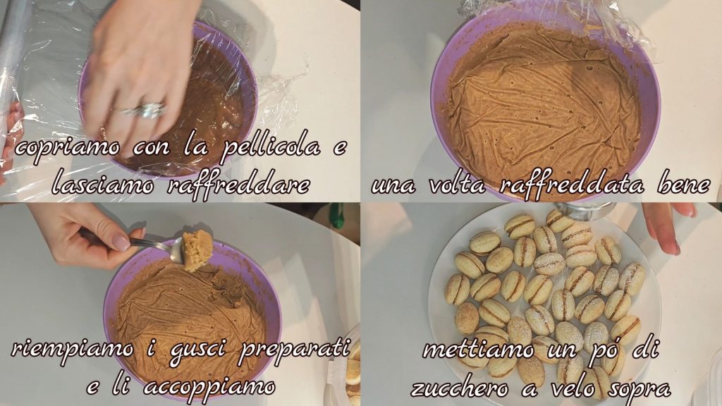 Couvrez avec du film alimentaire et laissez refroidir. Une fois refroidi, remplissez les coques et assemblez-les. Saupoudrez les noix de sucre glace.