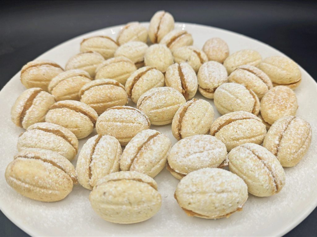 De jolis petits gâteaux et en même temps très délicieux, surtout si vous êtes amateurs de caramel ou de cacahuètes. Les coques sont faites avec une pâte sablée, refroidies puis farcies avec une crème faite avec le caramel et les cacahuètes 😋. Les noix sont idéales si l’on doit préparer un buffet de desserts car nous pouvons bien nous organiser et commencer la préparation quelques jours à l’avance !
