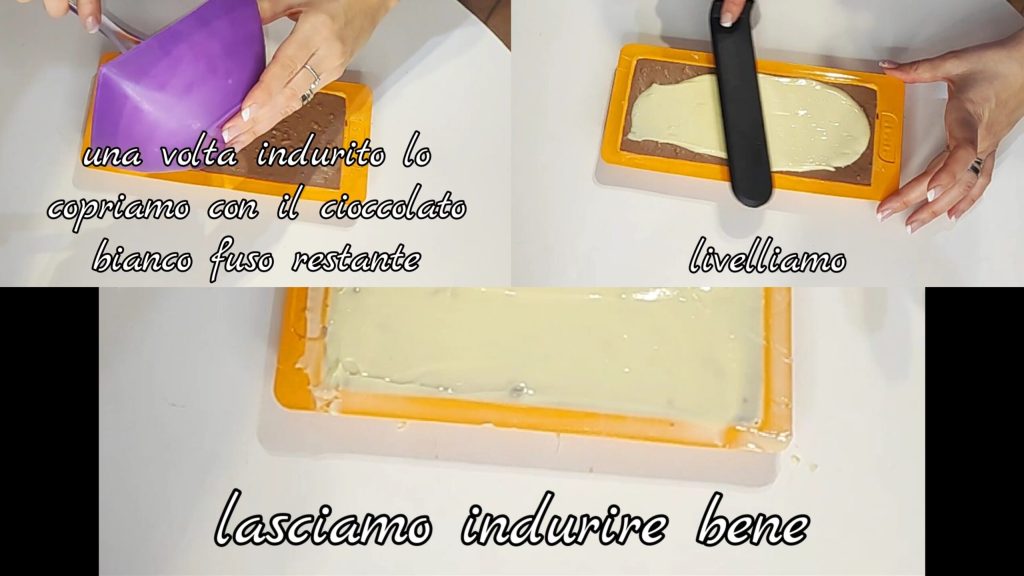 Une fois durci, nous le couvrons avec le reste du chocolat blanc pour la couverture (50g) fondu et l’égalons bien, en retirant les excès éventuels. Mettons de nouveau au frigo pour durcir bien le chocolat puis retirons le moule.