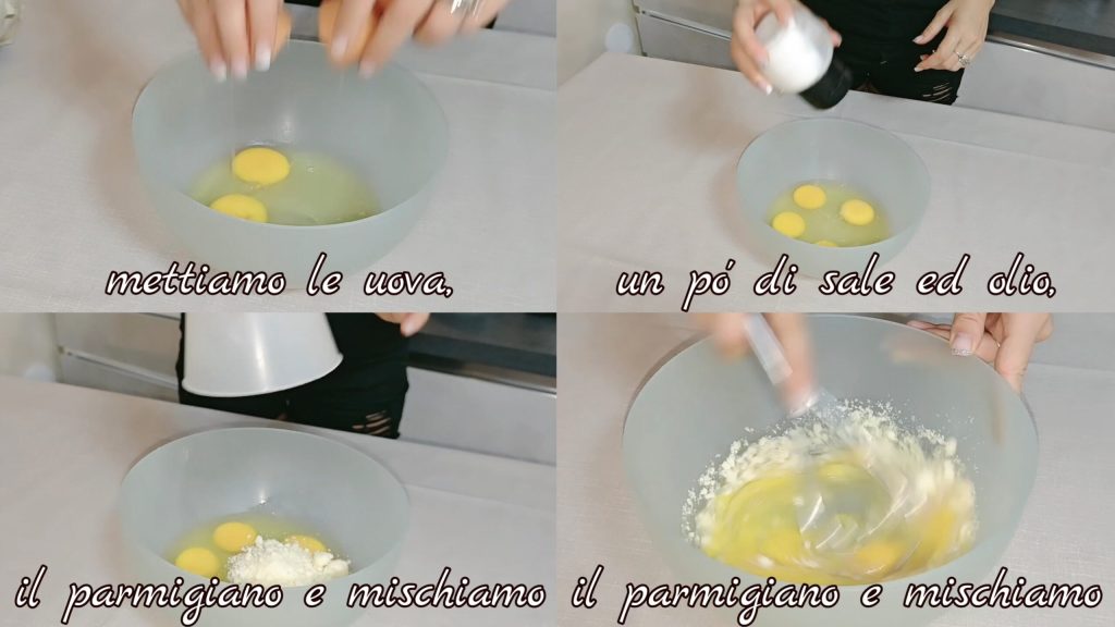 Dans un récipient, mettons les œufs, un peu de sel et d’huile, le parmesan et mélangeons.
