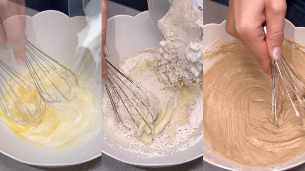 Dans un bol, battez l’œuf avec le lait. Ajoutez la farine de châtaigne et la levure, puis mélangez bien pour obtenir une pâte lisse et homogène, sans grumeaux.