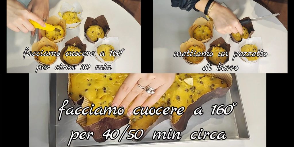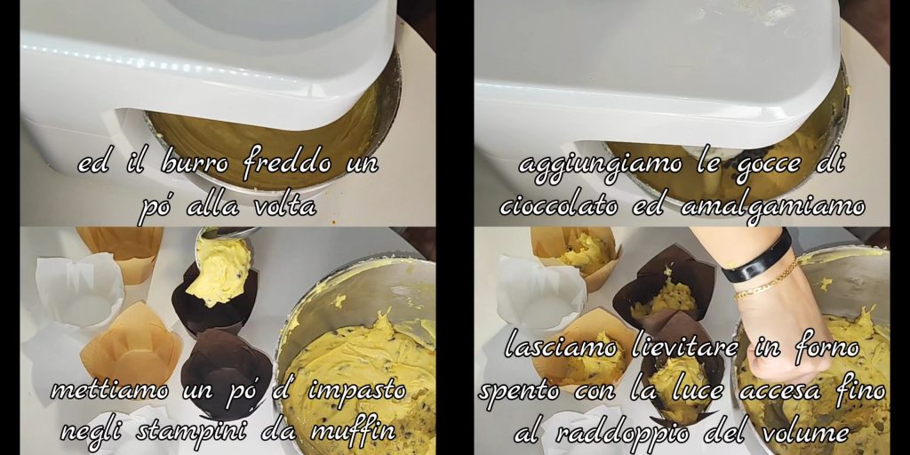 À la fin, mettons le beurre en morceaux, puis les pépites de chocolat et mélangeons bien. Mettons un peu de préparation dans les moules en papier et laissons lever dans le four éteint avec la lumière allumée jusqu’à doubler de volume.