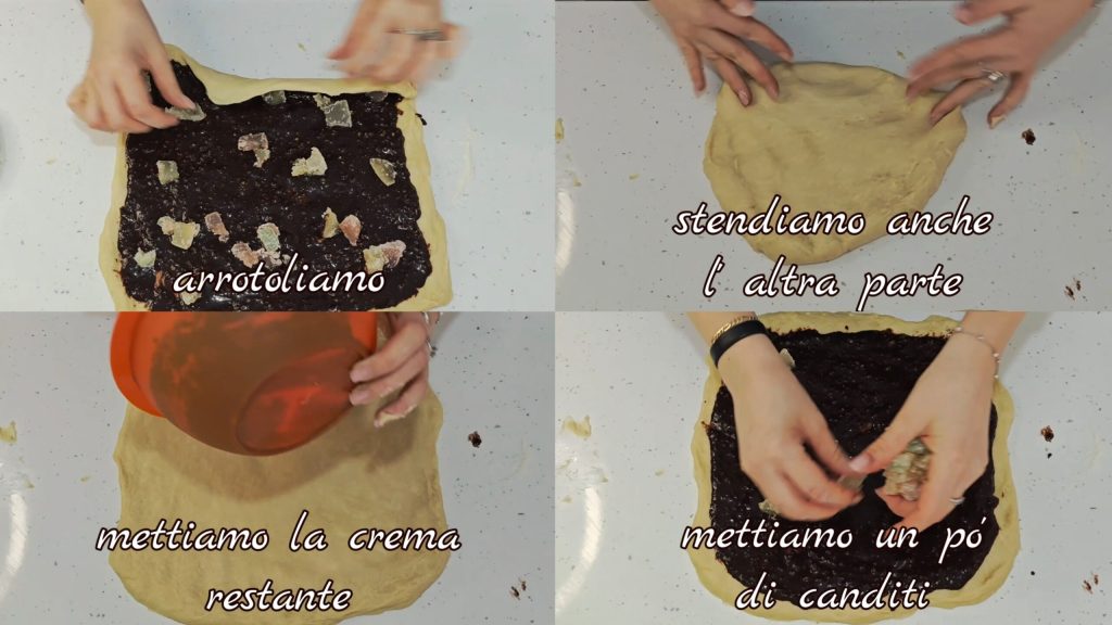 prenez la pâte et divisez-la en deux parties égales. Étalez la première partie et étalez environ la moitié de la crème préparée dessus. Ajoutez des fruits confits au goût