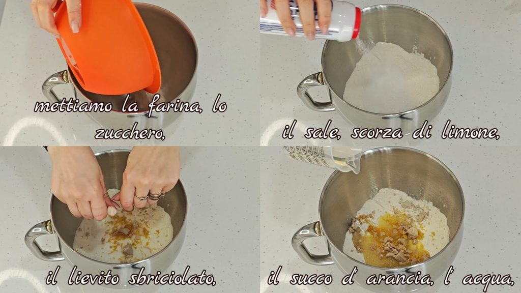 Mettons la farine, le sucre, le sel, le zeste de citron, la levure, le jus d’orange, l’eau,