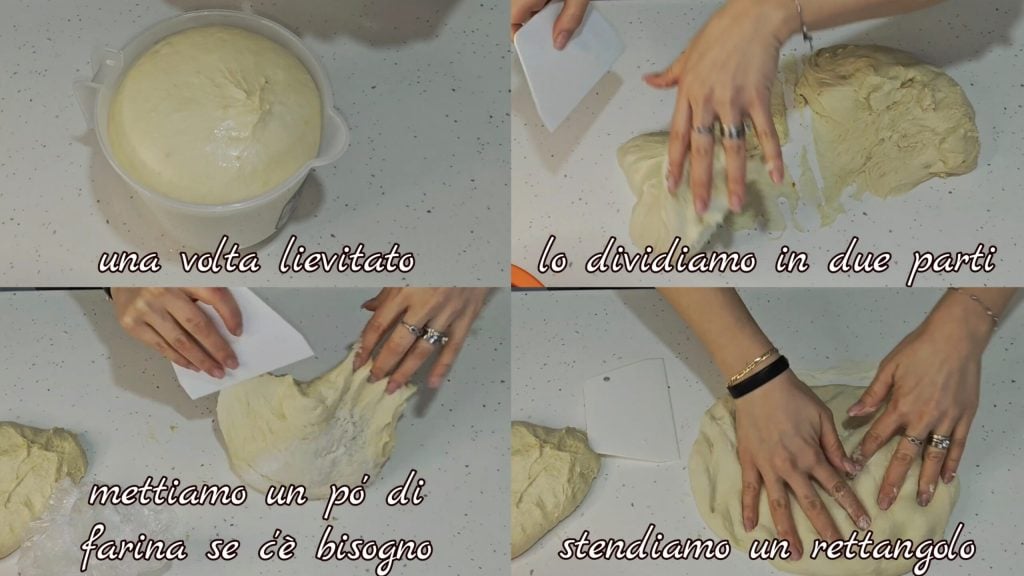 Une fois la pâte levée, nous la divisons en deux parties. Étendons le premier morceau en utilisant un peu de farine ou un peu d’huile si nécessaire.