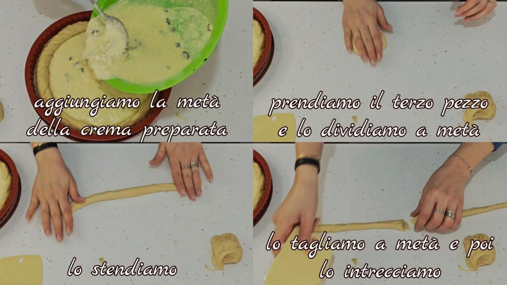 Nous mettons à l’intérieur la moitié de la crème préparée. Nous prenons le troisième morceau et le divisons en deux, nous l’étalons et puis le coupons à nouveau en deux et tressons.