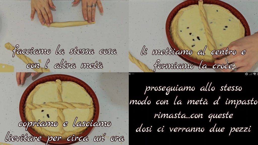 Nous faisons de même avec l’autre moitié. Nous les plaçons au centre et formons la croix. Nous couvrons et laissons lever pendant environ une heure. Nous procédons de la même manière avec la moitié restante de la pâte (avec ces quantités, il en sort 2 pièces).