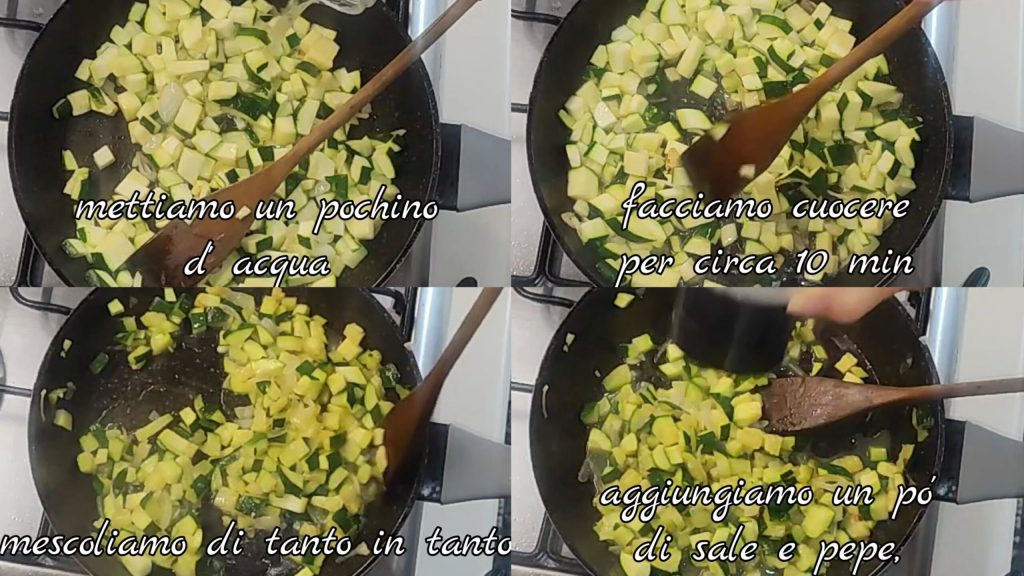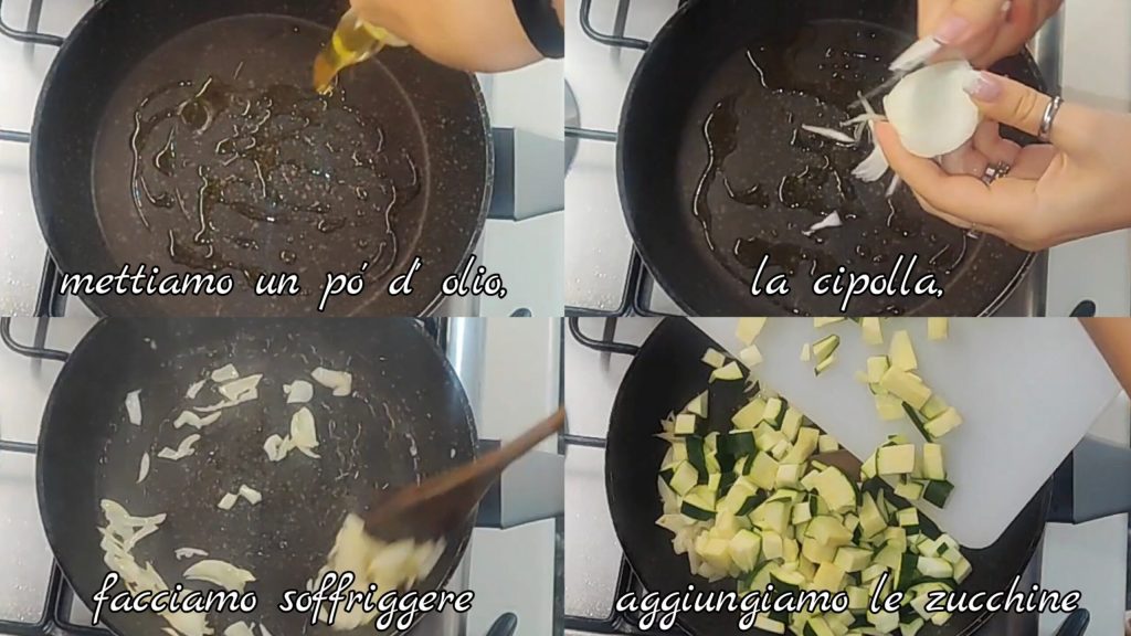 Dans une casserole, mettez un peu d’huile, ajoutez l’oignon et faites-le revenir. Ajoutez les courgettes nettoyées, lavées et coupées en dés.