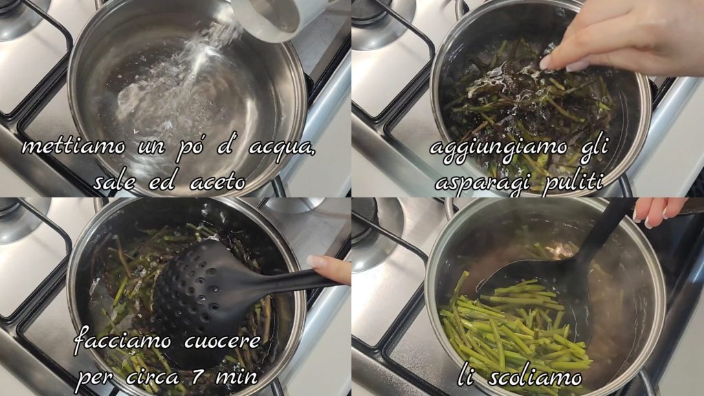 Dans une petite casserole, mettez un peu d’eau, du sel et du vinaigre, ajoutez les asperges nettoyées et lavées et faites-les cuire pendant environ 7 minutes. Après environ 7 minutes, égouttez-les.
