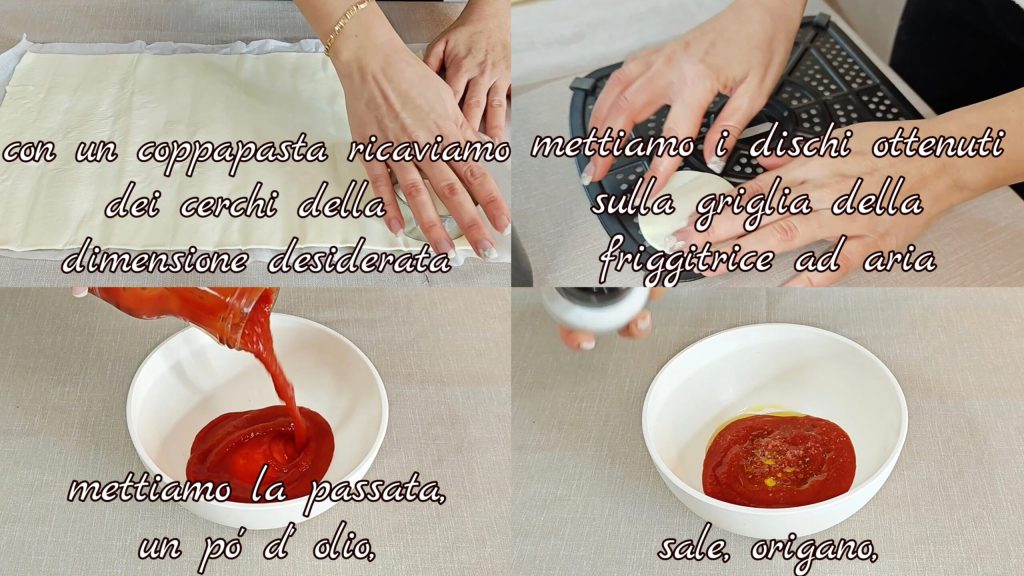 Ouvrez le rouleau de pâte feuilletée et avec un emporte-pièce, découpez des cercles de la taille désirée. Placez les disques obtenus sur la grille de la friteuse à air en laissant un peu d’espace entre eux. Dans un récipient, mettez la purée, un peu de sel, de l’origan, de l’huile