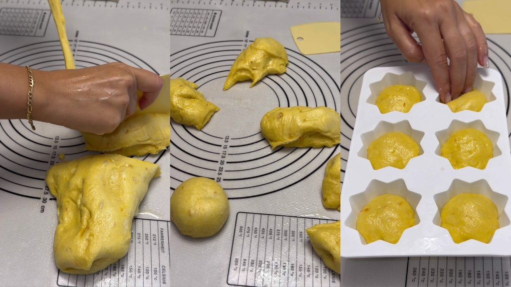 • Quand la pâte est levée, divise-la en 6 portions égales d’environ 90-100 g chacune. Façonne chaque portion en boule et place-la dans le moule à pandoros beurré.