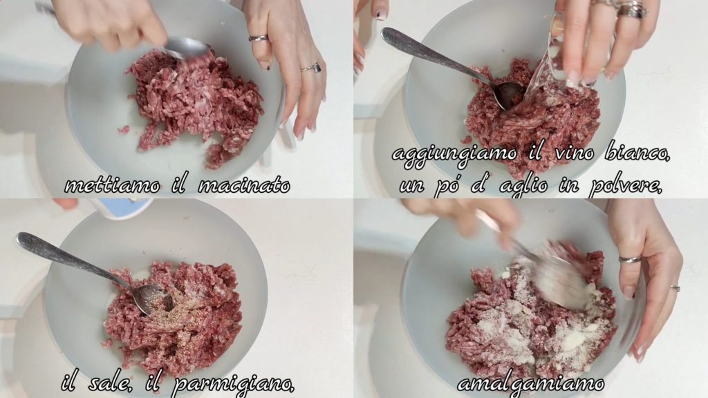 Dans un récipient, mettez la viande hachée, un peu d’ail en poudre, le vin blanc, un peu de sel, le parmigiano et mélangez bien.