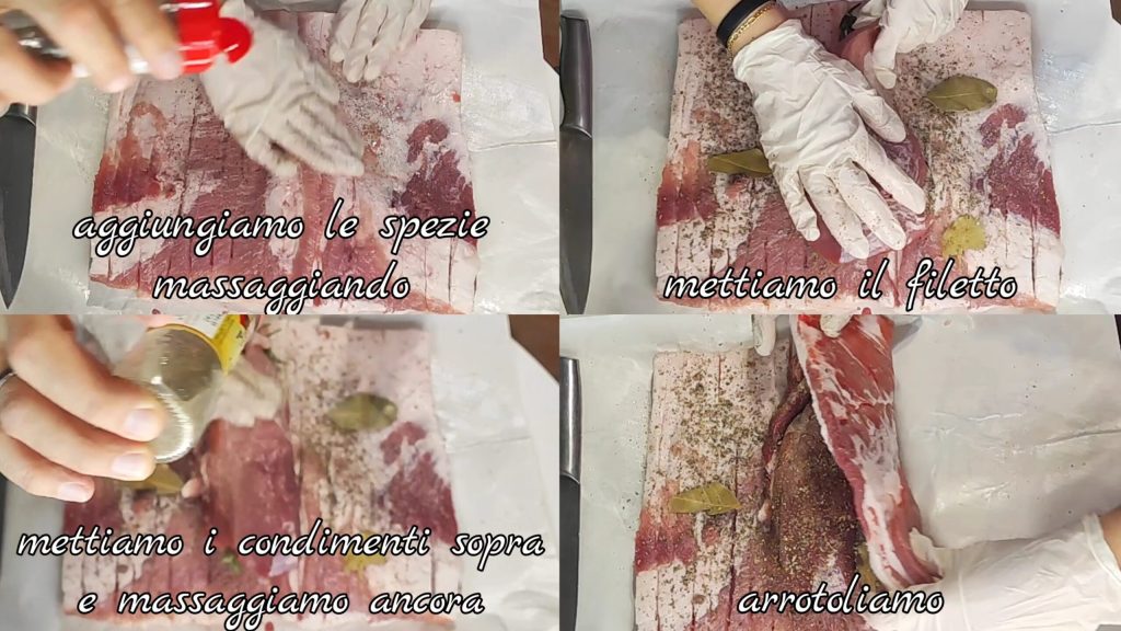 Une par une, nous ajoutons les épices en massant toujours. Nous mettons le filet dessus et ajoutons les assaisonnements. Nous roulons.
