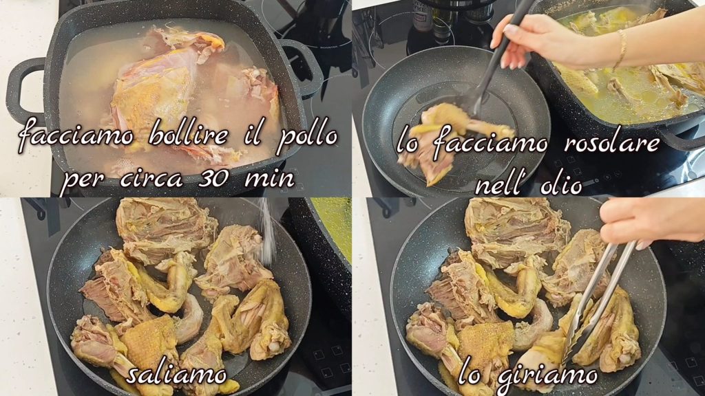 Pour commencer, faisons bouillir le poulet coupé en morceaux pendant environ 30 minutes puis le faisons dorer dans l’huile. Nous le salons et le retournons des deux côtés.