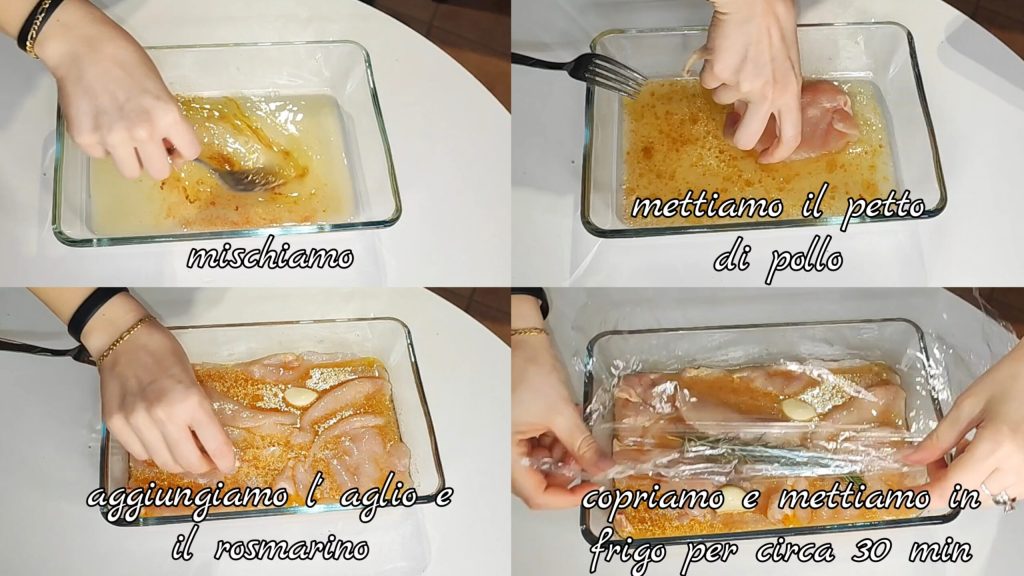 mélangez. Ajoutez les tranches de poitrine de poulet, un peu d’ail et de romarin, couvrez avec du film plastique et mettez au réfrigérateur pendant environ 30 min.