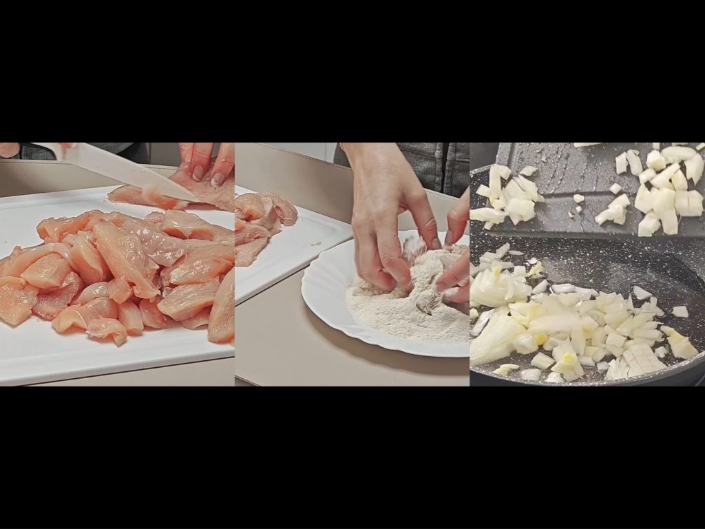 Coupez le blanc de poulet en fines tranches et farinez-les légèrement.