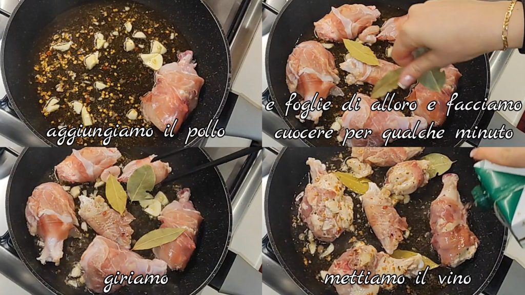 Ajoutons le poulet, quelques feuilles de laurier et faisons cuire pendant quelques minutes. Retournons le poulet et faisons dorer des deux côtés. Mettons le vin blanc.