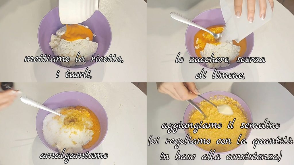 Dans un récipient, mettons la ricotta, les jaunes d’œufs, le sucre, un peu de zeste de citron et mélangeons. Ajoutons la semoule (nous devons ajuster la quantité en fonction de la quantité d’eau contenue dans la ricotta).