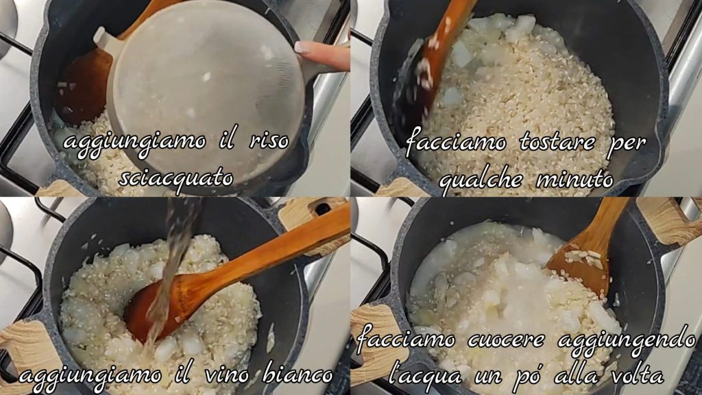 Ajoutez le riz préalablement rincé et faites-le griller. Ajoutez le vin blanc puis faites cuire en ajoutant l’eau/le bouillon peu à peu.