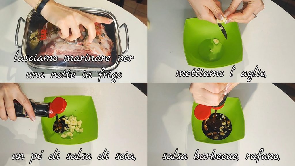 Mettez l’ail en morceaux, un peu de sauce soja, de la sauce barbecue, du raifort,