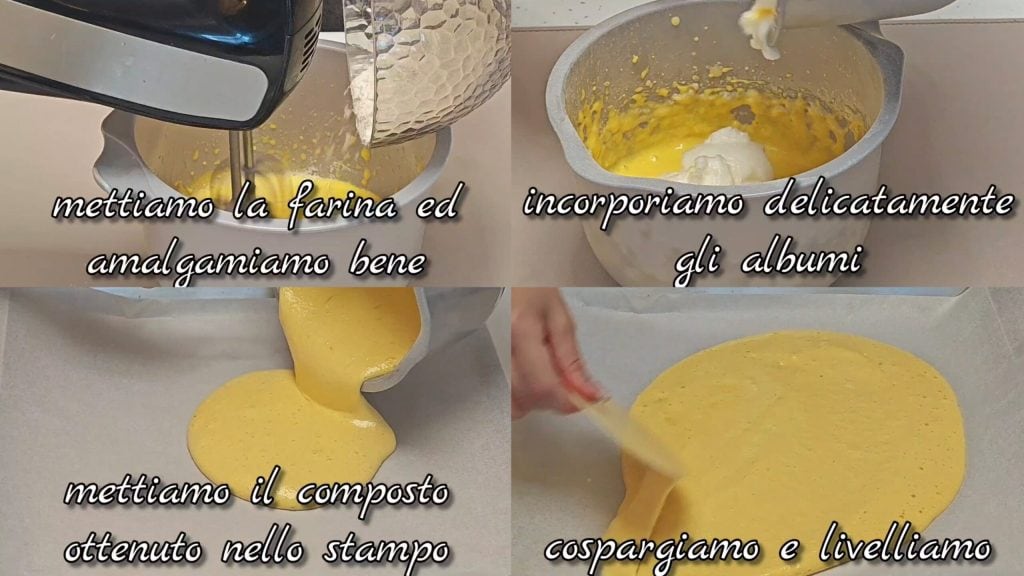 Ajoutez la farine et mélangez. Incorporez les blancs montés en neige petit à petit avec des mouvements délicats. Versez le mélange obtenu dans le moule avec le papier sulfurisé à l’intérieur. Saupoudrez et nivelez