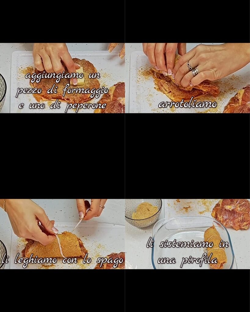 Mettons dessus un morceau de fromage et un de poivron et roulons. Nous les attachons avec de la ficelle et les plaçons dans le plat.