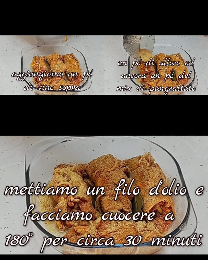 Continuons avec les autres de la même manière. Ajoutons du vin, un peu de laurier et encore un peu du mélange de chapelure obtenu. Ajoutons un filet d’huile et faisons cuire à 180° pendant environ 30 minutes.