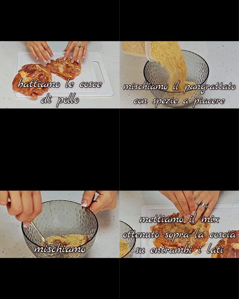 Battons les cuisses de poulet, mélangeons la chapelure avec des épices à votre goût et mélangeons. Passons la viande dans le mélange obtenu.