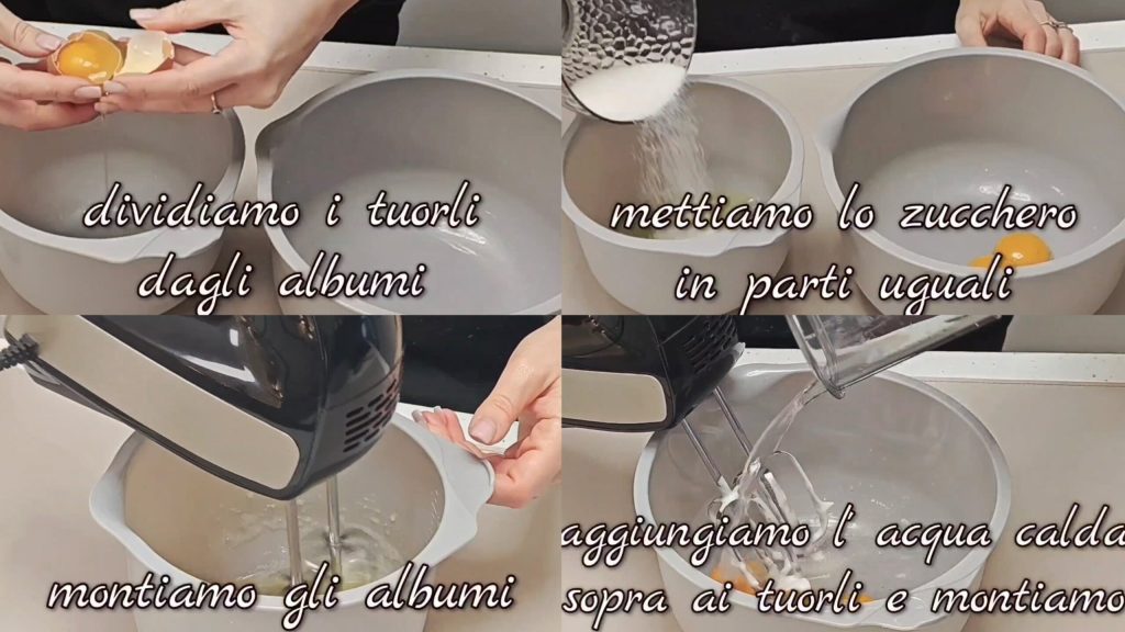 Commencez par séparer les jaunes des blancs d’œufs. Ajoutez le sucre en parts égales. Commencez à monter les blancs en neige avec un batteur électrique. Ajoutez l’eau chaude sur les jaunes et commencez à fouetter.