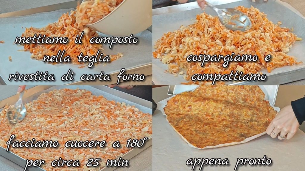 Tout d’abord, râpons les carottes, les pommes de terre et la scamorza. Ajoutons un peu de sel, de poivre et mélangeons. Ajoutons le parmesan et mélangeons.