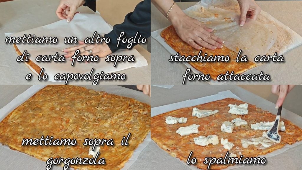 mettons une autre feuille de papier sulfurisé dessus et retournons puis retirons le papier sulfurisé attaché. Mettons le gorgonzola dessus et étalons-le.